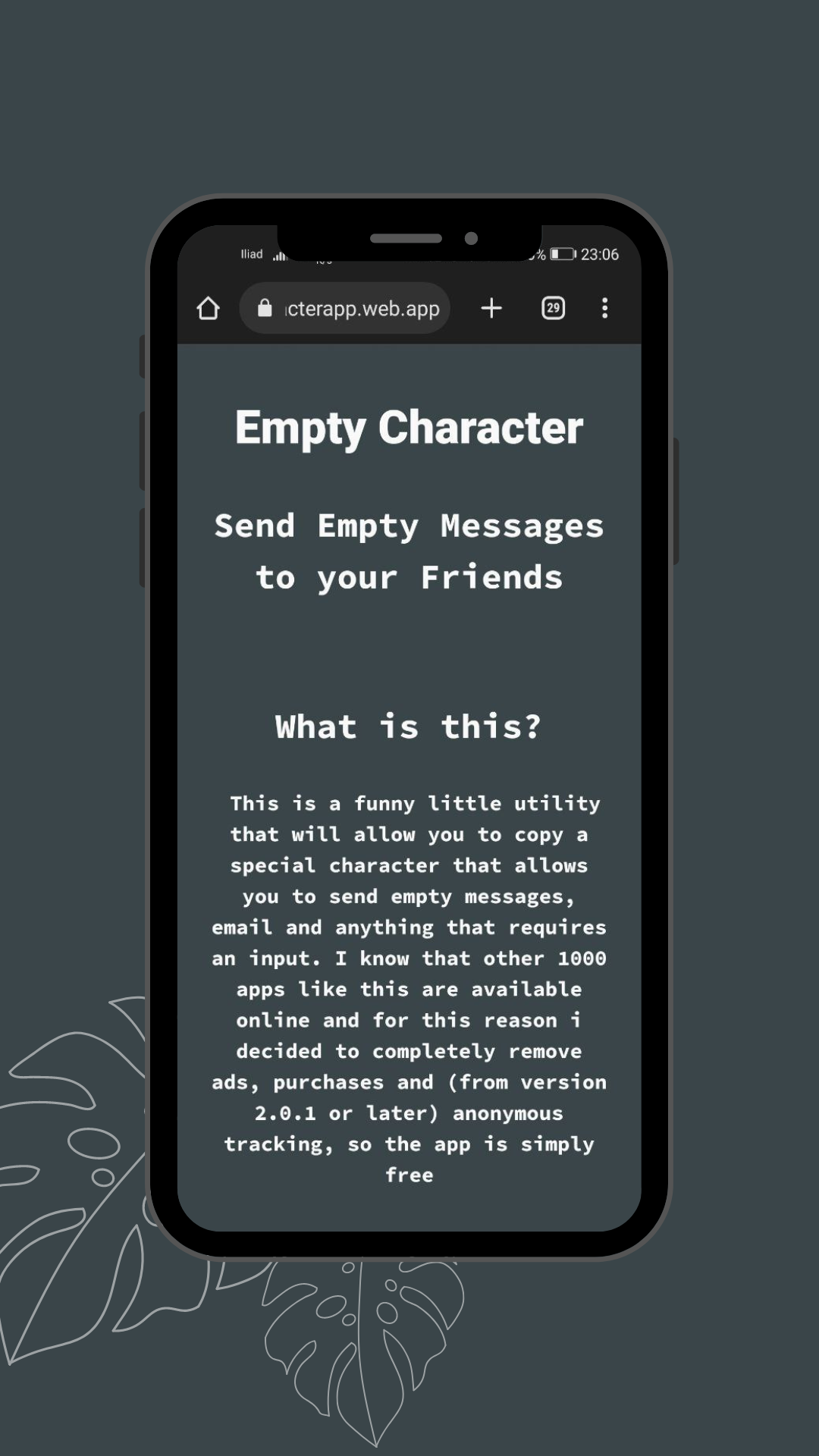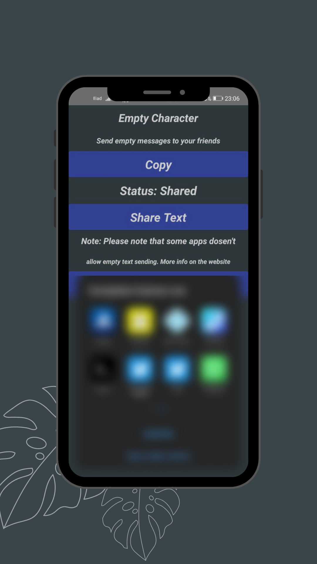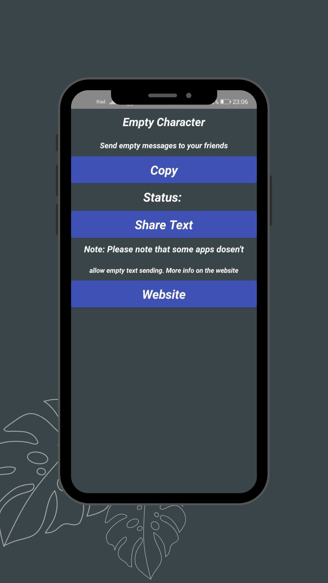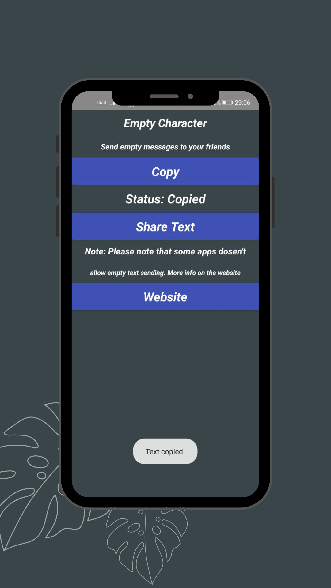 This is a funny little utility that will allow you to copy a special character that allows you to send empty messages, email and anything that requires an input. I know that other 1000 apps like this are available online and for this reason i decided to completely remove ads, purchases and (from version 2.0.1 or later) anonymous tracking, so the app is simply free